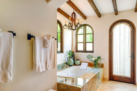 Inside, beautiful beamed ceilings, natural stone flooring and an earthy color scheme create an ambiance of Mediterranean bliss. A 15 ft vaulted ceiling presides over the enormous great room, where you’ll experience a relaxed, lounge setting, with a retractable glass wall leading outside.